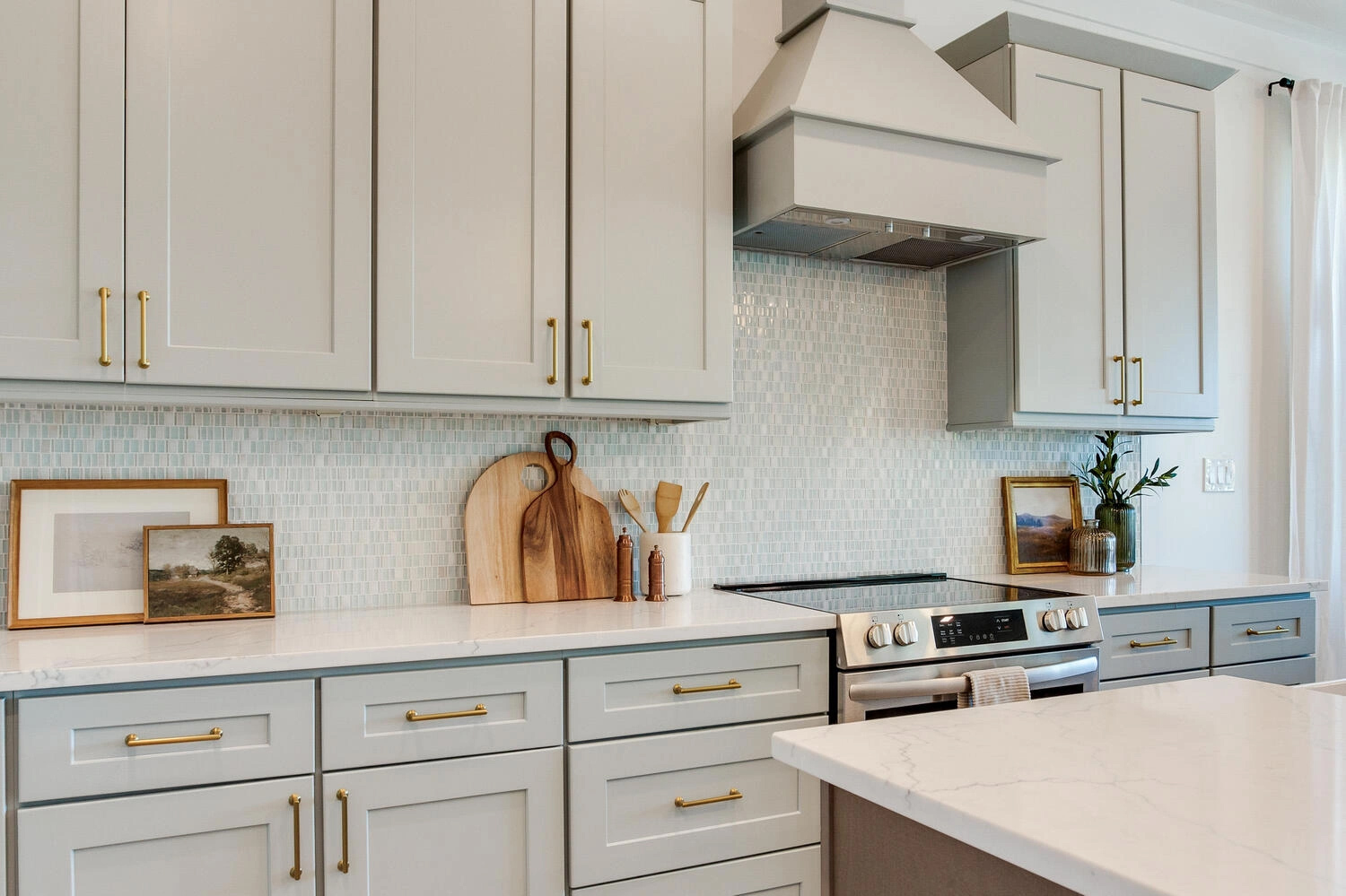 Inside, the home is designed with an inviting, open-concept layout that prioritizes height and light. Soaring 9’6” ceilings and 8-foot interior doors create an expansive atmosphere, while detailed coastal trim and custom tilework throughout the bathrooms provide a refined, high-end finish. The chef’s kitchen serves as the heart of the home, featuring 42-inch shaker cabinetry, under-cabinet lighting, and premium quartz countertops designed for large family gatherings.