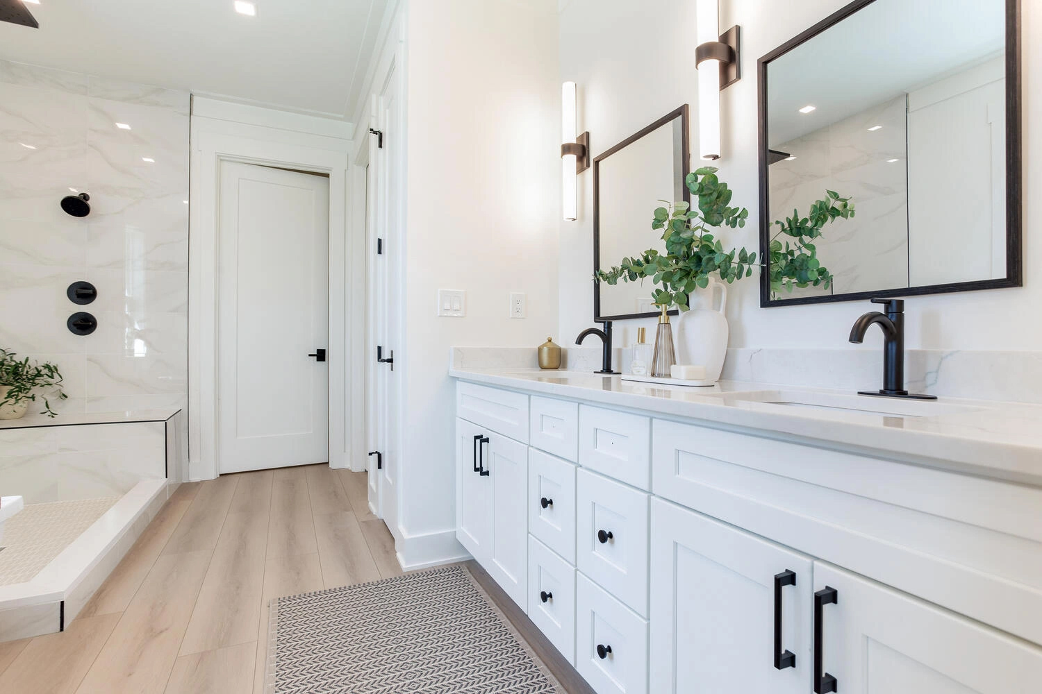 • Modern Gourmet Kitchen: Equipped with custom-lit shaker cabinetry and expansive quartz surfaces, the kitchen is designed for both daily function and aesthetic appeal.